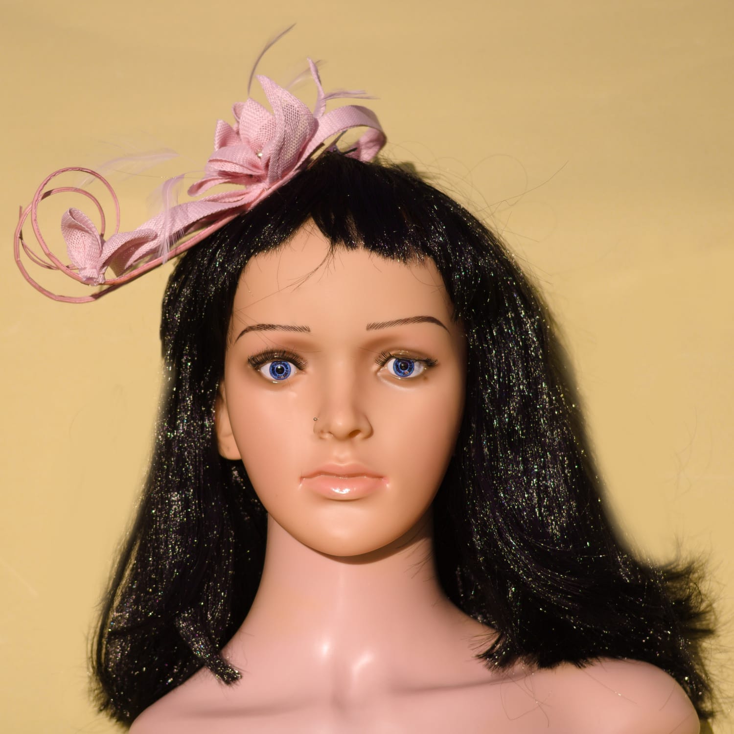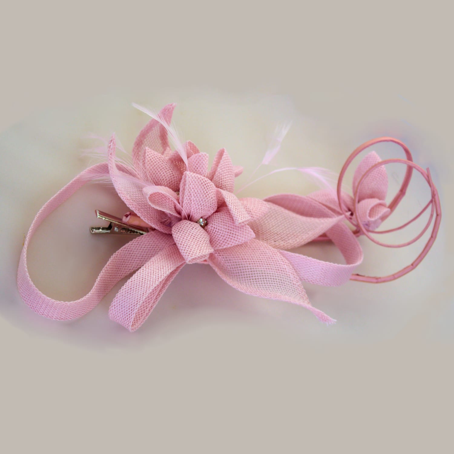 * Elegant Floral Design – Pale pink sinamay fascinator with loops, feathers & quills